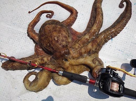 ▲ 潮が緩い朝イチはタコ釣り コニ=1kg級をGET